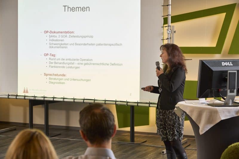 Auch wir waren vor Ort – insbesondere, um den Fachvortrag unserer Kollegin Monika Mendl, Bereichsleitung Abrechnung, zu begleiten. In ihrem Vortrag „GOÄ – Update für den Fachbereich Fußchirurgie“ stellte Frau Mendl praxisrelevante Abrechnungsvarianten vor und ging dabei detailliert auf die OP-Dokumentation, den OP-Tag und die Sprechstundenleistungen ein. Besonders betonte sie die Bedeutung des Zielleistungsprinzips nach §4 Abs. 2 GOÄ sowie die korrekte Dokumentation von Besonderheiten und Schwierigkeiten, um Faktorerhöhungen fundiert begründen zu können. Zudem zeigte sie auf, wie zeitintensive Untersuchungen, Beratungen oder Sonographien in der GOÄ-Abrechnung adäquat berücksichtigt werden können.